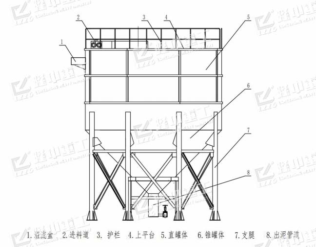 處理物料的廢水經(jīng)過(guò)料道進(jìn)入中心進(jìn)料筒,并經(jīng)過(guò)緩流、絮凝等一系列作用,使增稠的底流泥漿由罐體底部的出料口排出,并進(jìn)入壓濾機(jī)等其他設(shè)備,壓濾成泥餅。罐體上部產(chǎn)生清潔度較高的清水(溢流澄清液),由頂部的出水口排出,清水可循環(huán)利用,實(shí)現(xiàn)生產(chǎn)廢水零排放。