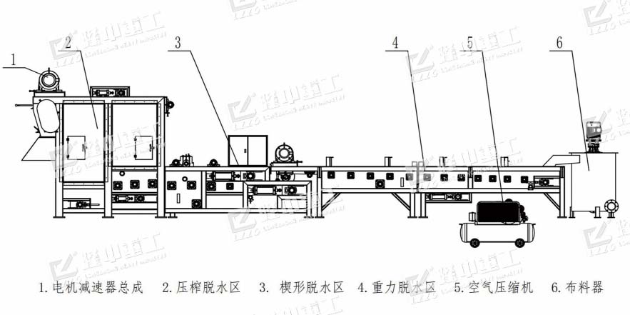 混合裝置、布料裝置、重力脫水裝置、楔形脫水裝置、擠壓輥高壓脫水裝置、自動加藥系統(tǒng)、空壓機、氣電控制系統(tǒng)等。
