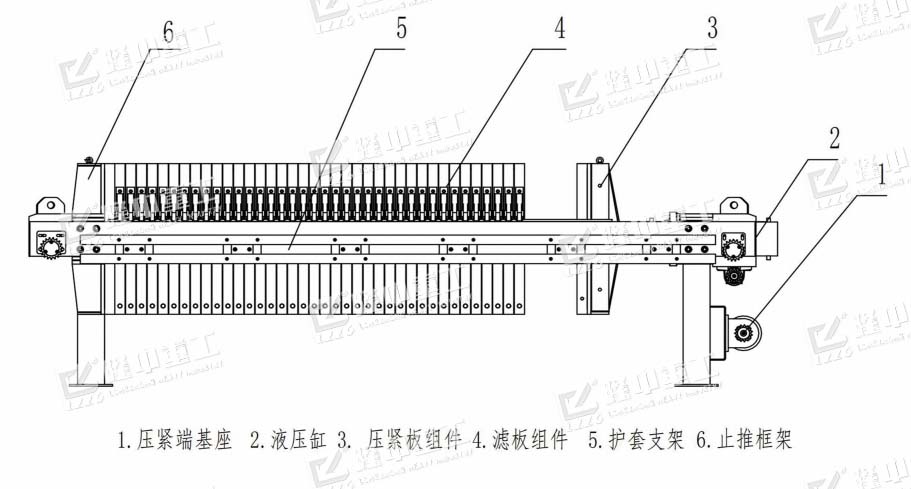 廂式壓濾機是通過濾板的擠壓,使污泥內(nèi)的水通過濾布排出,從而達到脫水目的。也稱進漿脫水,即一定數(shù)量的濾板在強機械力的作用下被緊密排成一列,濾板面和濾板面之間形成濾室,過濾物料在強大的正壓下被送入濾室,進入濾室的過濾物料其固體部分被過濾介質(zhì)(如濾布)截留形成濾餅,液體部分透過過濾介質(zhì)而排出濾室,從而達到固液分離的目的。