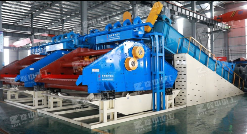 經(jīng)過(guò)破碎篩分后的物料進(jìn)入螺旋洗砂裝置,清洗之后合格物料將進(jìn)入后端尾礦干排裝置進(jìn)行脫水,由于固體物粒大小的不同,比重不同,所以液體中的沉降速度不同,細(xì)顆粒浮游在水中成溢流出,粗顆粒沉于槽底,由螺旋洗砂一體機(jī)的螺旋推向上部排出,同時(shí)利用水力和機(jī)械力使礦石碎散并擦洗礦石上的雜質(zhì)和泥土,洗下礦石表面細(xì)泥并分離。旋流器的沉沙嘴位于尾礦干排篩的上方,形成濃縮后的物料落入尾礦干排篩,而旋流器分離的水體流入到回收水箱內(nèi)部。其余廢水進(jìn)入反水裝置排出,完成整個(gè)流程。