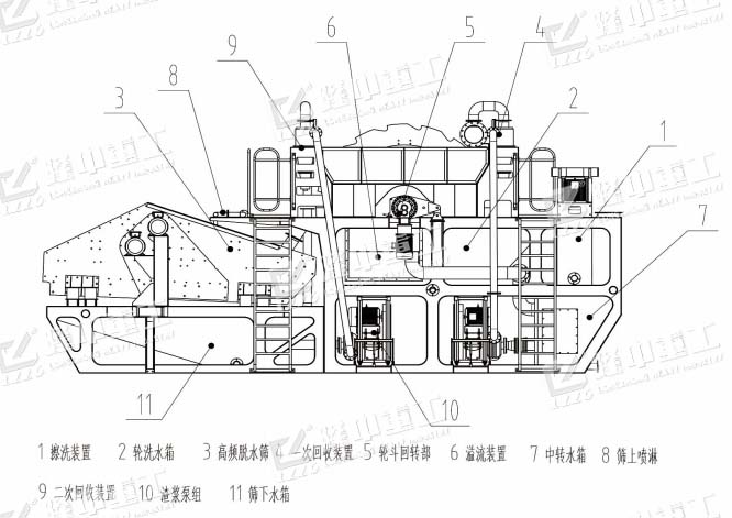 物料先經(jīng)過擦洗機進行擦洗,除去砂顆粒表面附著的泥粉;擦洗后的物料進入輪洗洗砂機進行二次清洗、控水,達到泥沙分離效果,將清洗后的粗、細砂進入脫水篩進行脫水。