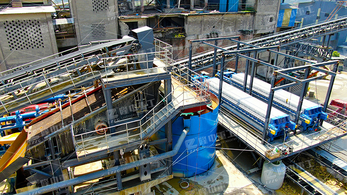 原料先經(jīng)過破碎機進行處理,之后采用的擦洗一體機可除去砂石黏土、黏泥塊,對物料進行水洗篩分;通過細沙回收裝置,使細砂得到充分回收。后端污水進到濃密灌以后、進行初步分離——泥漿下沉,清水通過溢流槽流出,經(jīng)管道重新返回清水池,進行循環(huán)利用。