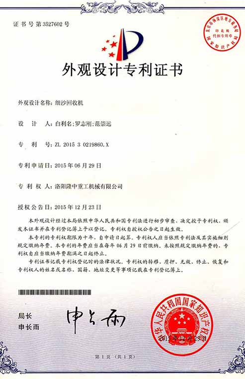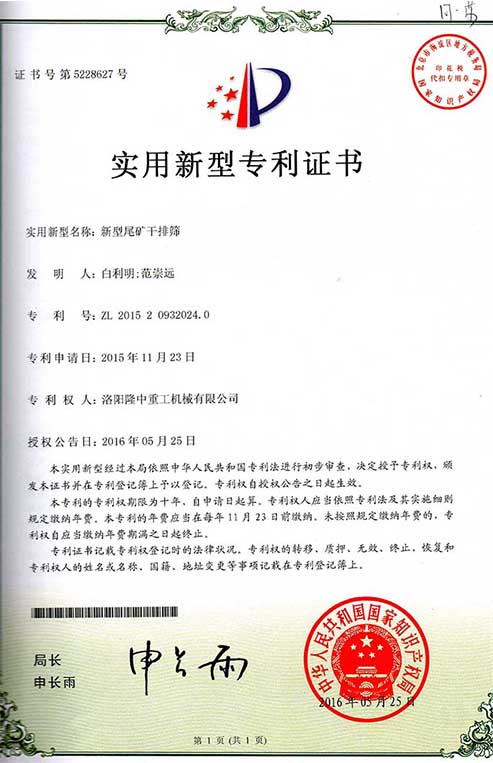Long Zhong heavy industry patent certificate